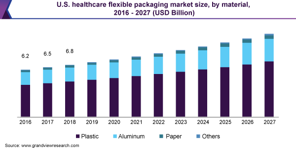 The North America healthcare flexible packaging market size was valued at USD 8.1 billion in 2019 and is anticipated to expand at a CAGR of 5.4% over the forecast period. Factors such as large consumption of high-value drugs, and high health awareness are few factors attributed to the industry growth.
