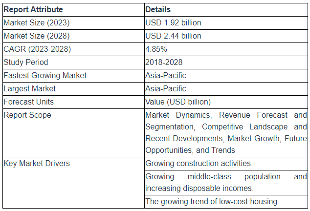 Hyderabad, July 24, 2023 (GLOBE NEWSWIRE) -- According to a new market research report titled "Floor Adhesives Market Report (2023-2028)," the market is estimated at USD 1.92 billion in 2023. It is expected to register a CAGR of 4.85% during the forecast period.