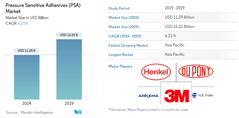 The Pressure Sensitive Adhesives Market size is estimated at USD 11.29 billion in 2024, and is expected to reach USD 15.25 billion by 2029, growing at a CAGR of 6.21% during the forecast period (2024-2029).