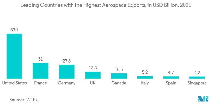 In 2021, the United States contributed around USD 89.1 billion in aerospace exports, making it the leading country in terms of aerospace exports. Some of the top aerospace makers, including Boeing and Lockheed Martin, are based in this country.