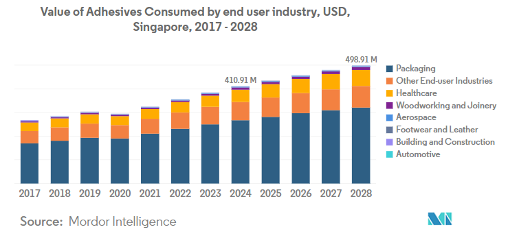 Singapore's adhesives are also largely being consumed across the healthcare industry. Singapore's healthcare system is regarded as one of the greatest in the world, offering some of the most cutting-edge medical treatments. This is due to robust regulatory oversight, a cost-sharing structure that includes both the commercial and public sectors and payments from medical savings accounts.