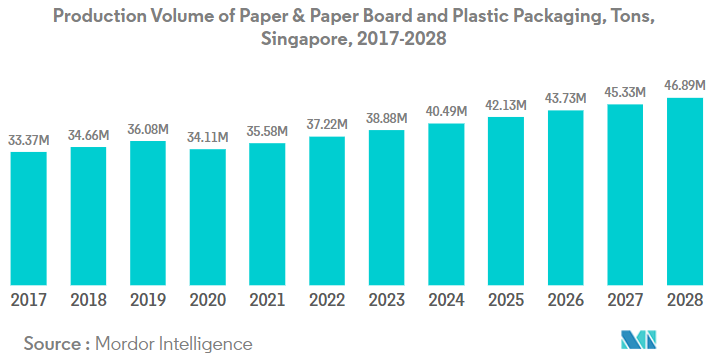 Packaging is mainly used for protection, containment, information, utility, and promotion. The growing Singaporean packaging market segment is expected to register a CAGR of 3.77% during the forecast period. In 2017, packaging usage accounted for 33.4 million ton of packaging, including paper, paperboard, and plastic packaging. Due to the COVID-19 outbreak in 2020, the market registered a negative growth of -5.54% due to disruptions in the supply chain, shortage of packaging material, restrictions on the import and export of goods, and factories operating at low capacity.