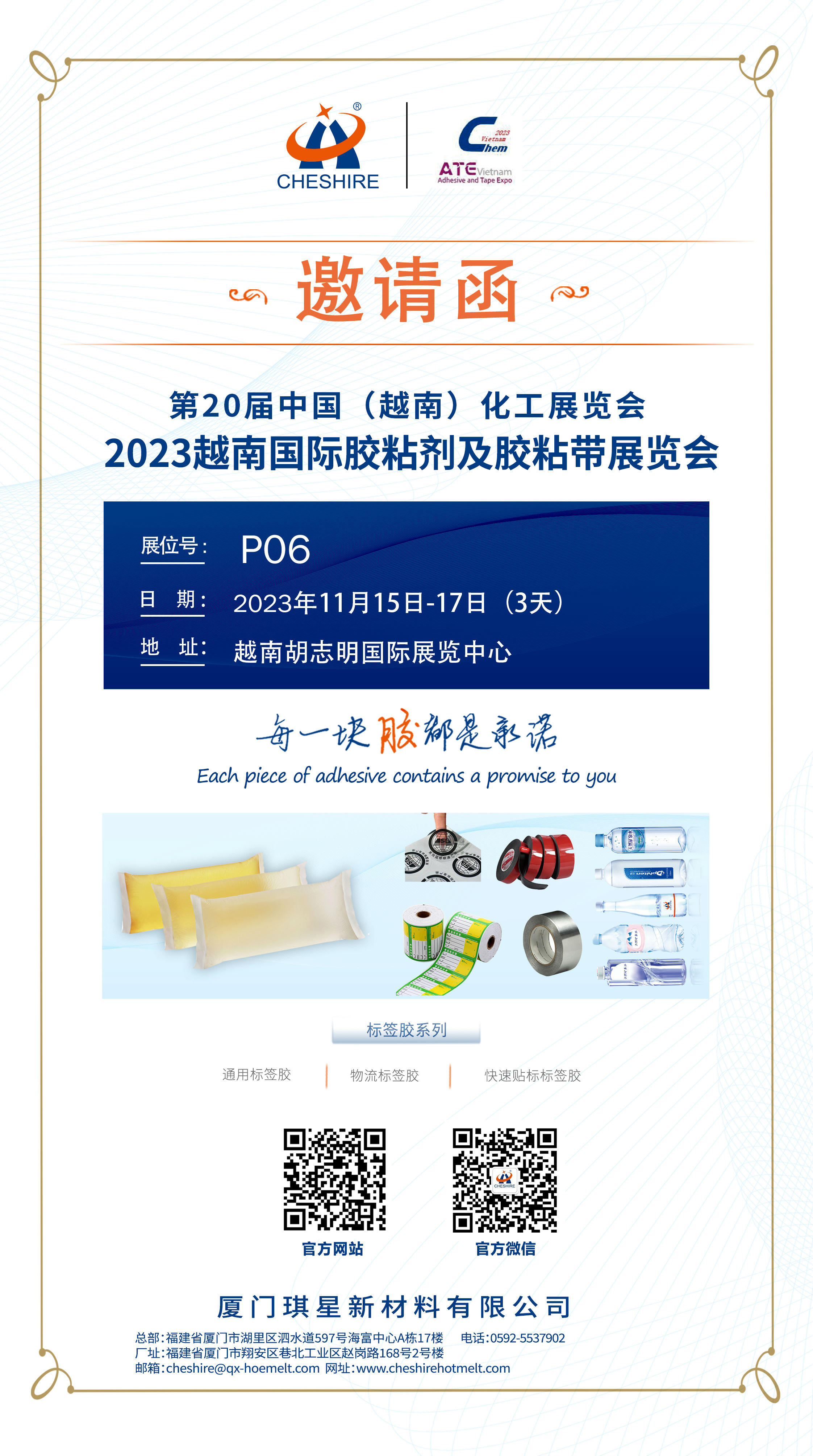 11月中下旬,2023越南国际胶粘剂及胶粘带展、亚洲(印尼)卫生用品及材料展两大国际行业展览盛会分别于越南和印尼盛大开幕。作为集研发技术、生产制造、营销服务于一体的科研技术型知名品牌企业,我司将携全系列粘合剂产品及解决方案亮相展会现场,与全球知名企业同台“竞技”,向来自世界各地的客户朋友们全方位展示琪星品牌实力。诚邀您拨冗莅临,共鉴精彩,共话未来!