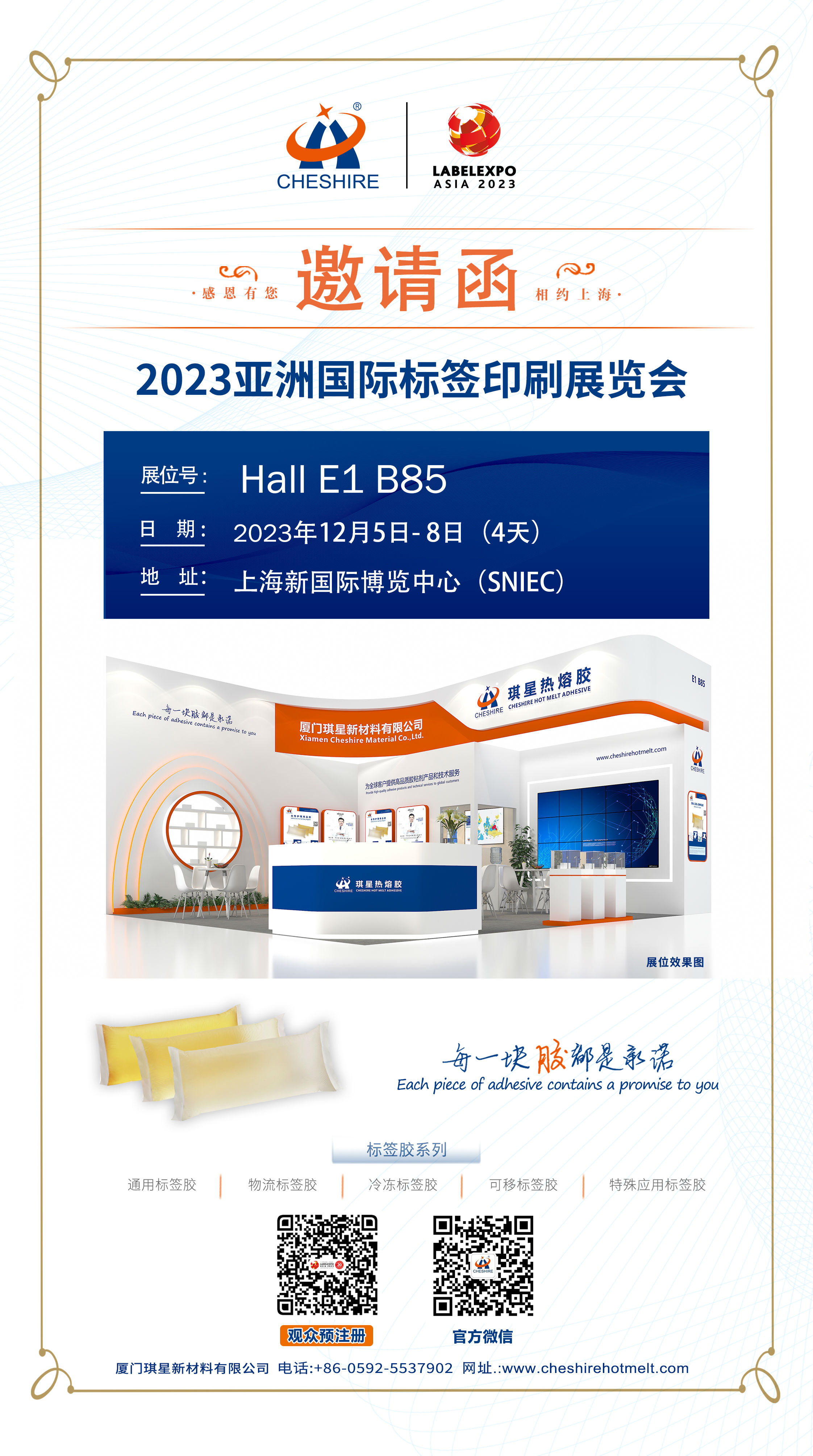 步履不停,共赴新程!2023亚洲国际标签印刷展览会(Labelexpo Asia)将于今年12月5日-8日在上海新国际博览中心盛大开幕。届时,我司将携带全系列标签粘合剂产品及应用解决方案,隆重亮相E1馆B85展位。在此,诚挚邀请新老客户朋友拨冗出席,共同开启一场合作共赢的璀璨盛会。
