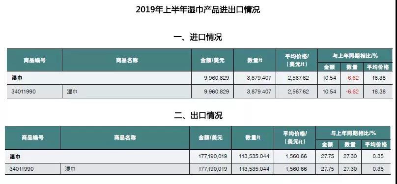 2019年上半年,湿巾产品的进口量同比降低6.62%,进口额相较去年同期增长10.54%,进口湿巾的平均价格增长18.38%,呈现出量减价升的趋势。
