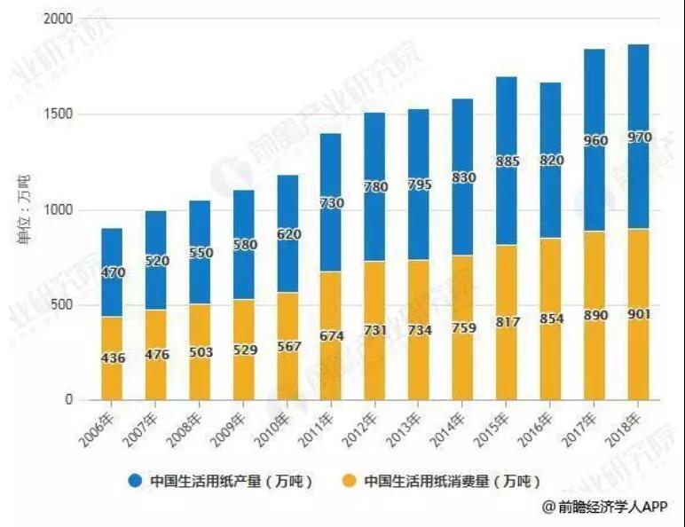 2006-2018年中国生活用纸产销量统计情况
