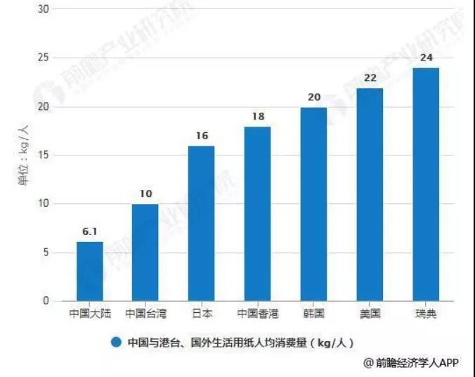 中国与港台、国外生活用纸人均消费量对比情况