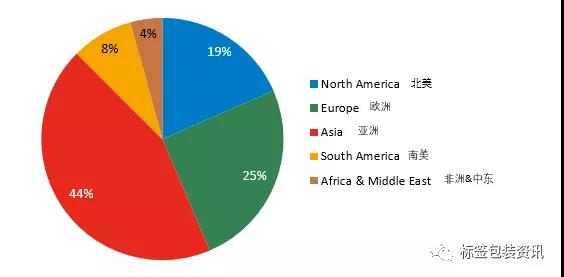 AWA亚历山大沃森公司近期的市场调查结果显示,2018年全球标签市场总销售额约为286亿美元,总销量约640亿平方米,全球各地区销量比例如图一所示。亚洲仍然是全球最大市场,占有约44%的份额。欧洲和北美紧随其后,分别占比25%和19%。