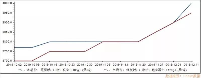 江浙沪地区瓦楞纸、箱板纸10月1日至今价格走势
