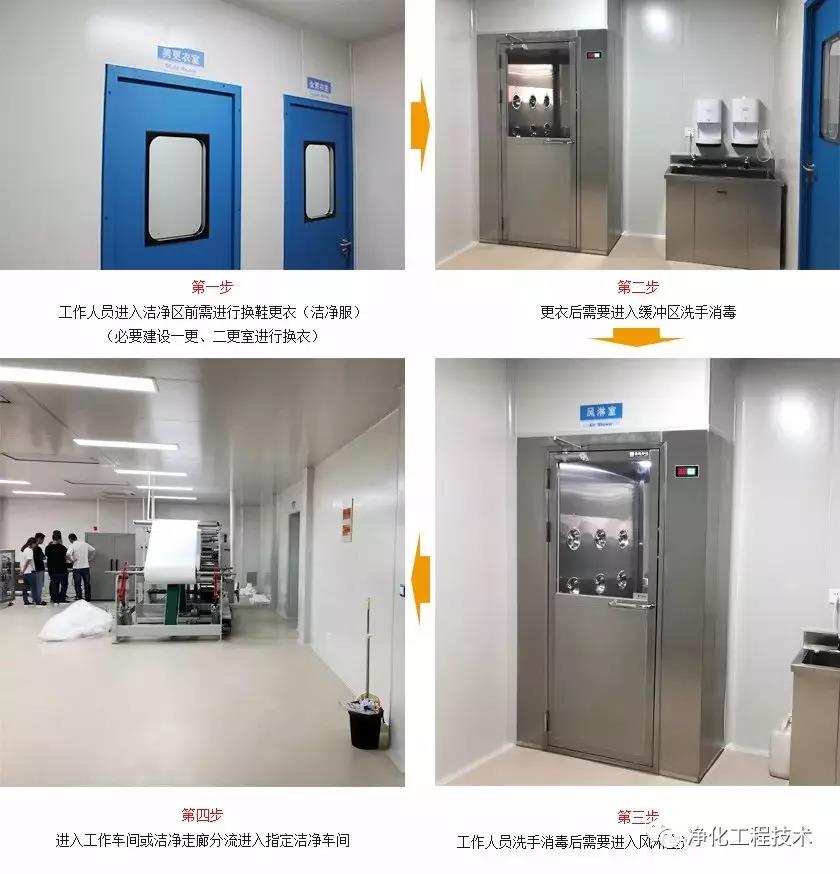 从更衣——洗手消毒/缓冲—— 风淋消毒——洁净走廊,各个洁净车间都必须无尘化。以下为浙江某医疗器械股份有限公司人员流动示意图。