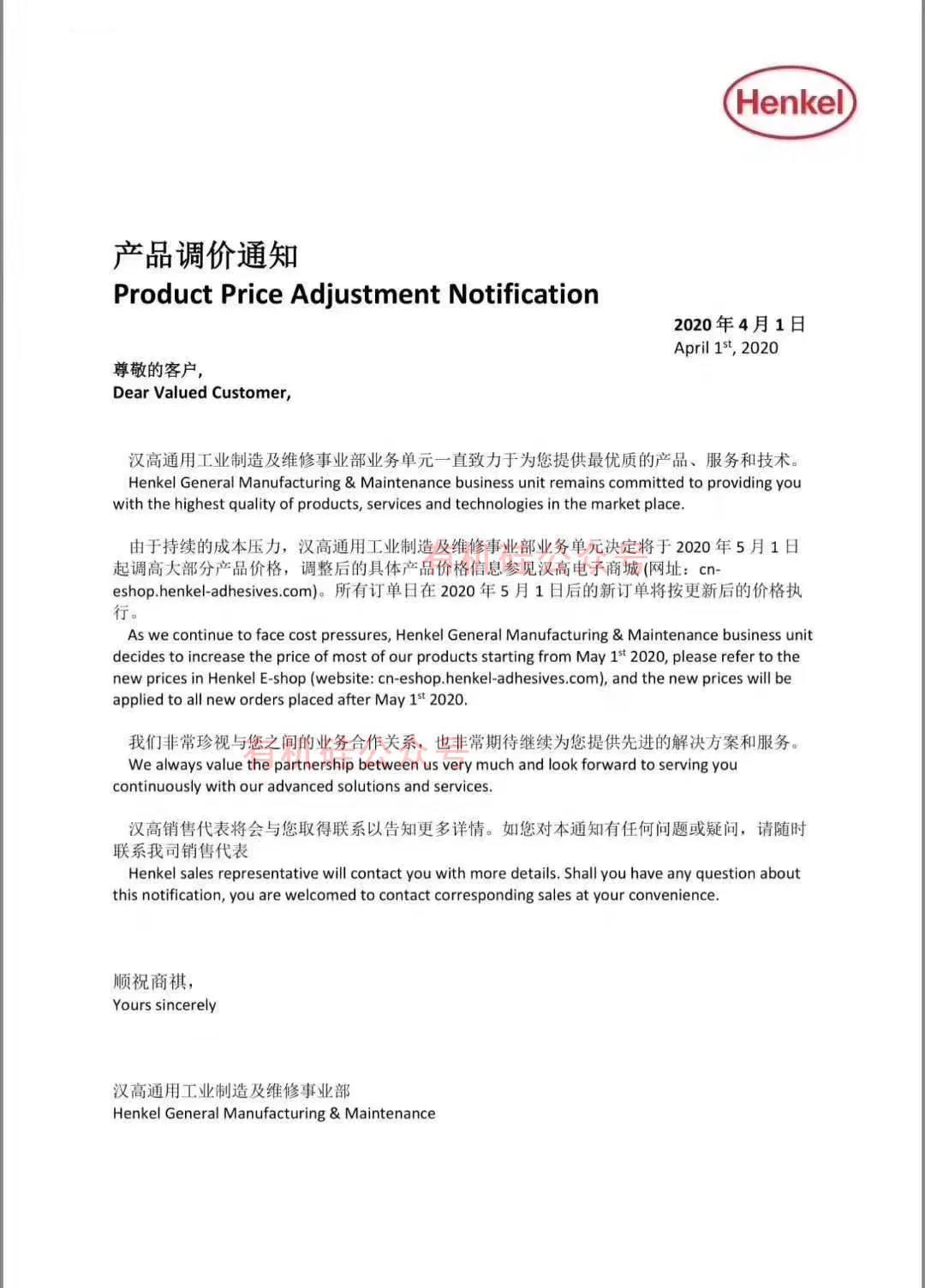 4月1日,汉高通用工业制造及维修事业部发布产品调价通知称,由于持续的成本压力,将于2020年5月1日起调高大部分产品价格。