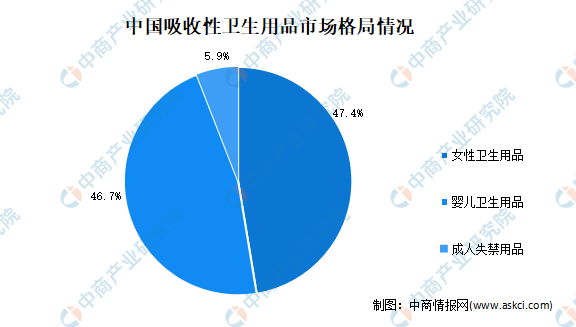 2019年我国吸收性卫生用品市场规模(市场总销售额)从市场结构来看,女性卫生用品占比最高,达到47.4%,其次是婴儿卫生用品,占比为46.7%,成人失禁用品占比为5.9%。