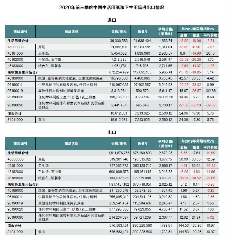 资讯丨2020年前三季度中国生活用纸和卫生用品进出口情况