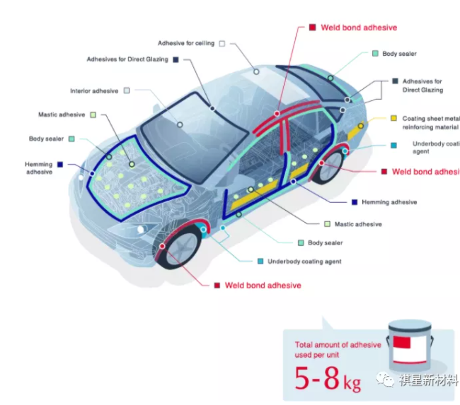 在建设交通强国大背景下,我国交通方式日趋多元化,交通运输工具用胶粘剂的需求量持续上升。全国大大小小和汽车胶粘剂相关的企业达到3000多家,以单车用胶量20-40KG推测,我国汽车工业用胶粘剂市场规模已年逾50万吨/年。尤其新能源汽车产销量,近几年发展势头迅猛,加之动力电池技术的不断更新,使得用胶量也将得到持续提升。胶粘剂是汽车生产中不可或缺的原材料。在汽车制造中,良好的粘接技术的使用可以提高驾乘的舒适性,降低噪音、减震、轻量化、降低能耗、简化工艺,提高产品质量,因此,胶粘剂在车辆设计、制造中起到了不可替代的作用。根据功能来分,胶粘剂在汽车中的应用主要分为车体用胶、动力系统用胶、维修用胶。汽车胶粘剂对汽车质量可靠性、生产工艺便捷性和提供新的解决方案及赋予汽车新的功能都起到很重要的作用。