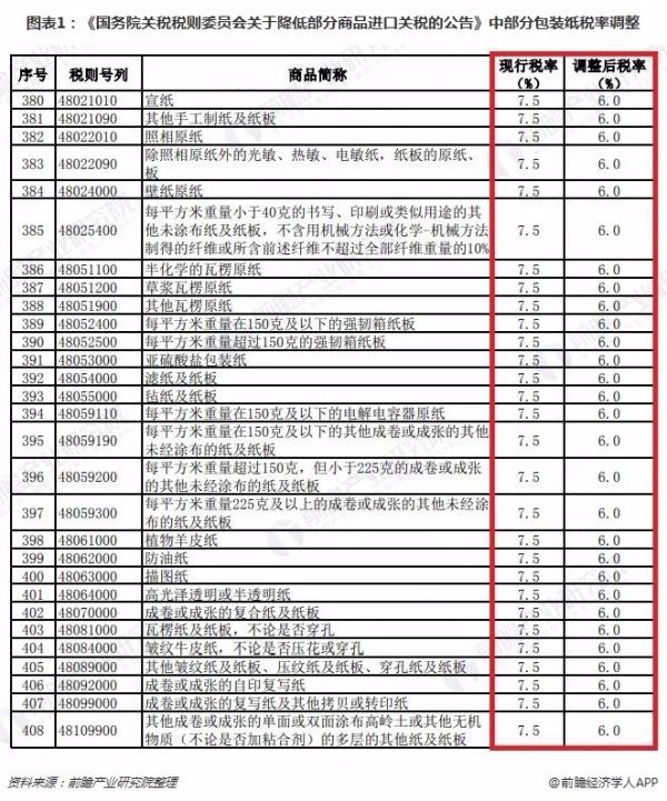 2018年9月30日,国务院关税税则委员会发布《国务院关税税则委员会关于降低部分商品进口关税的公告》。在全部1585个税目中,与造纸行业相关的主要是瓦楞原纸、箱纸板、部分特种纸原纸、纸制品,进口税率从原来的7.5%下降到6%。其他纸种,如文化纸、白卡纸和生活用纸,此次调整没有影响。
