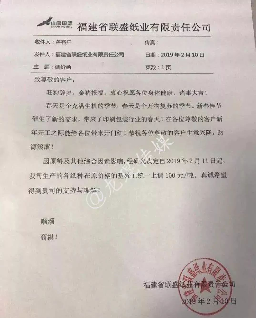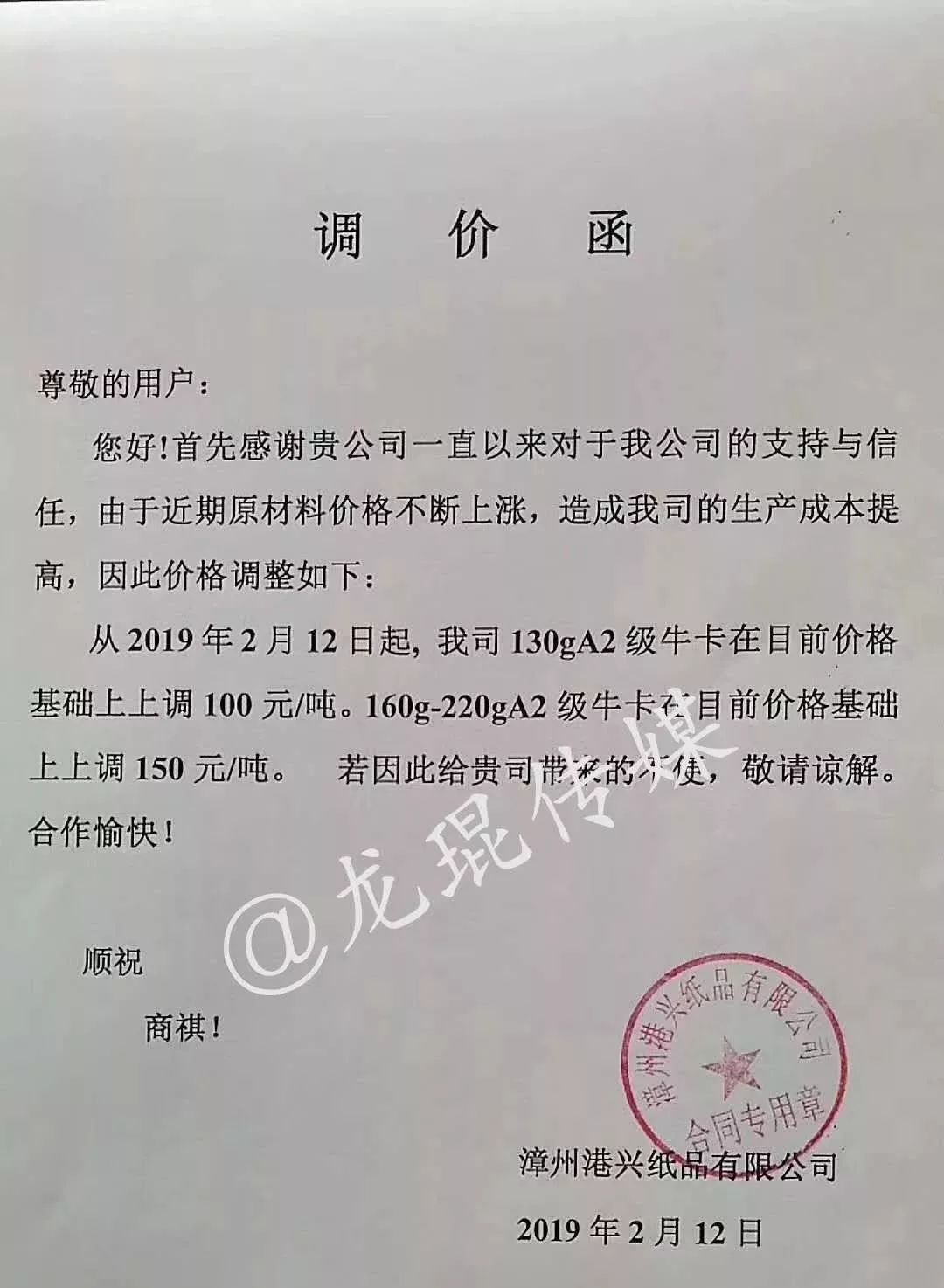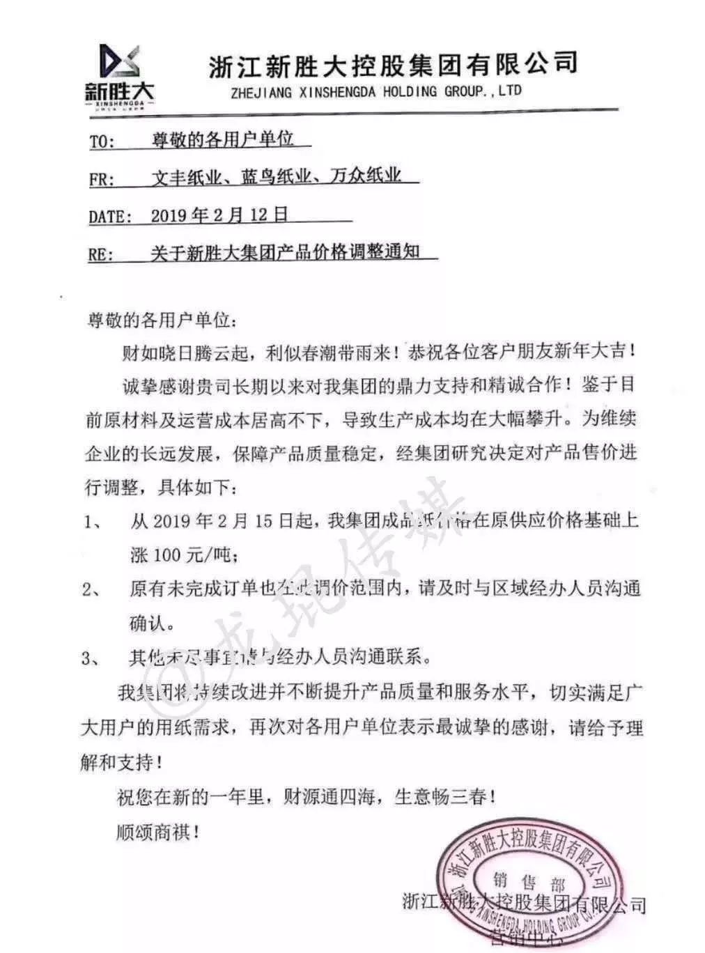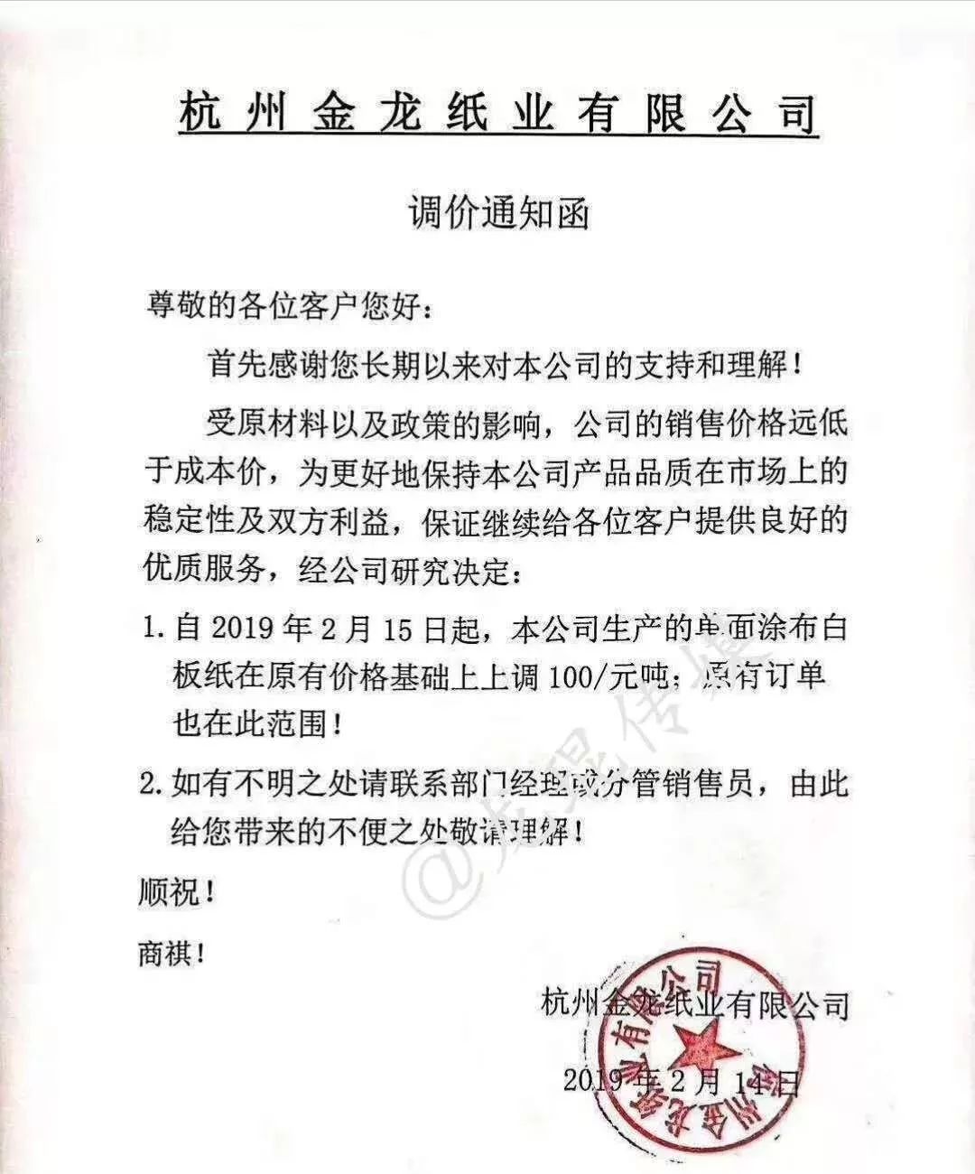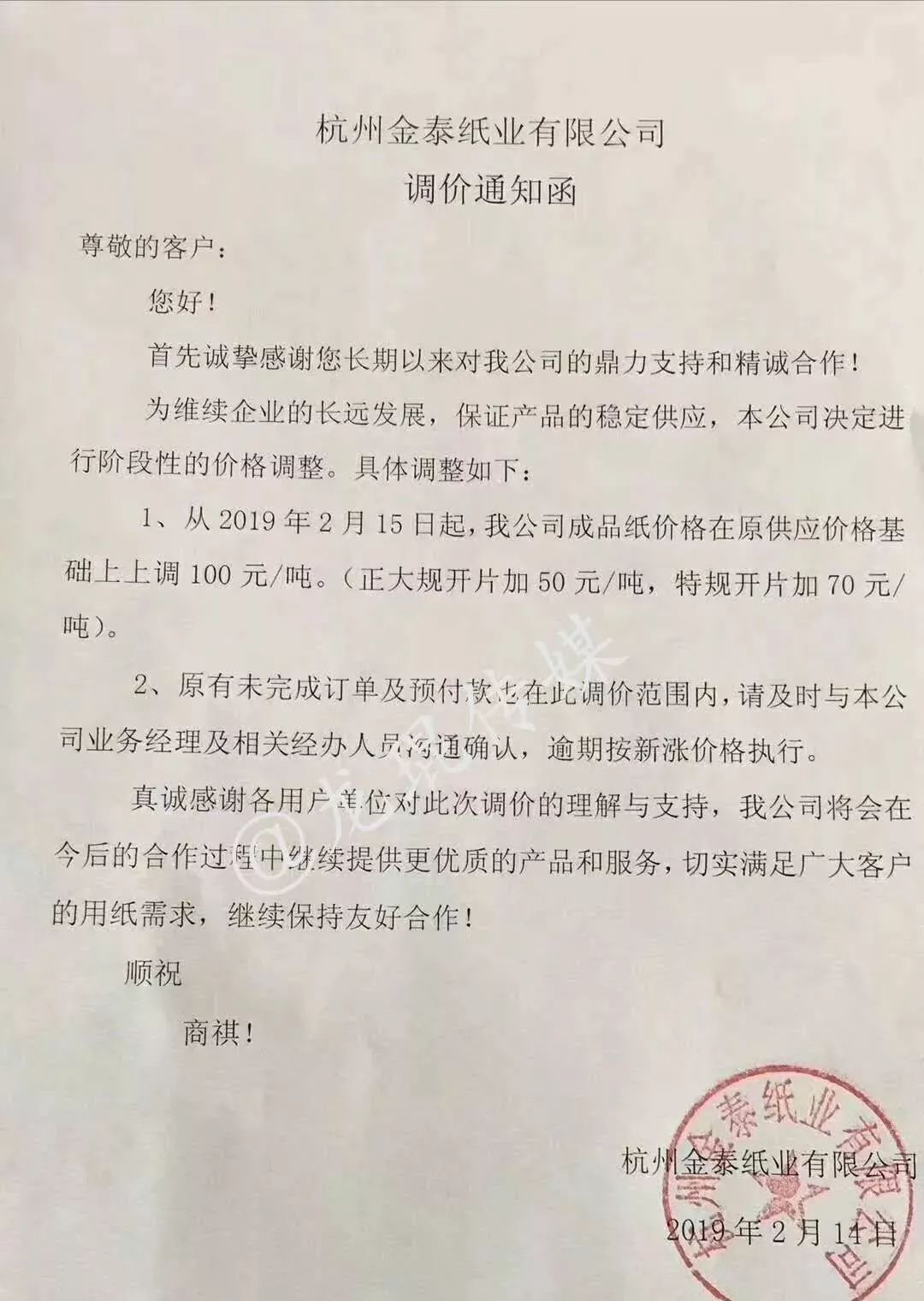 自2019年2月15日起,成品纸价格在原供应价格基础上上调100元/吨,原有订单也在此调价范围内。