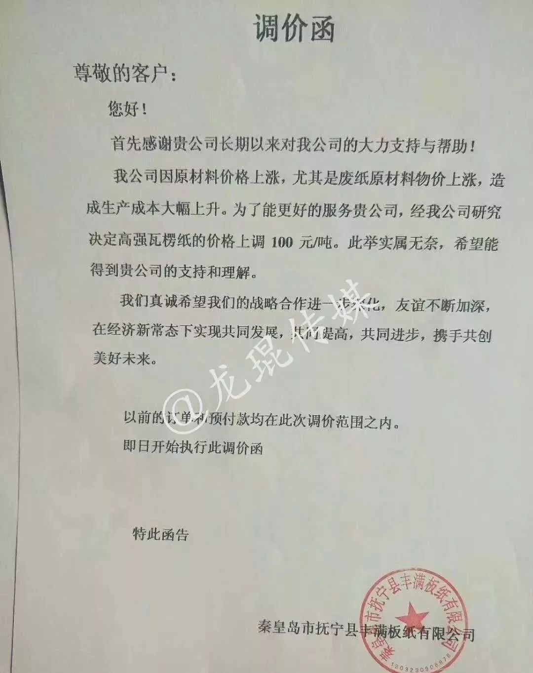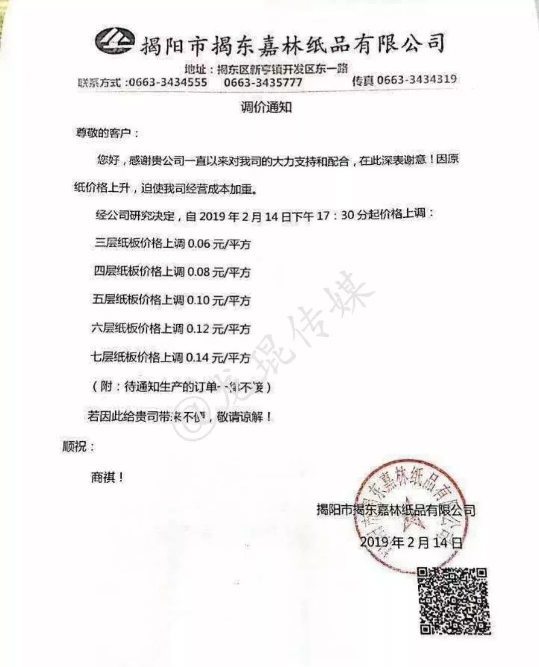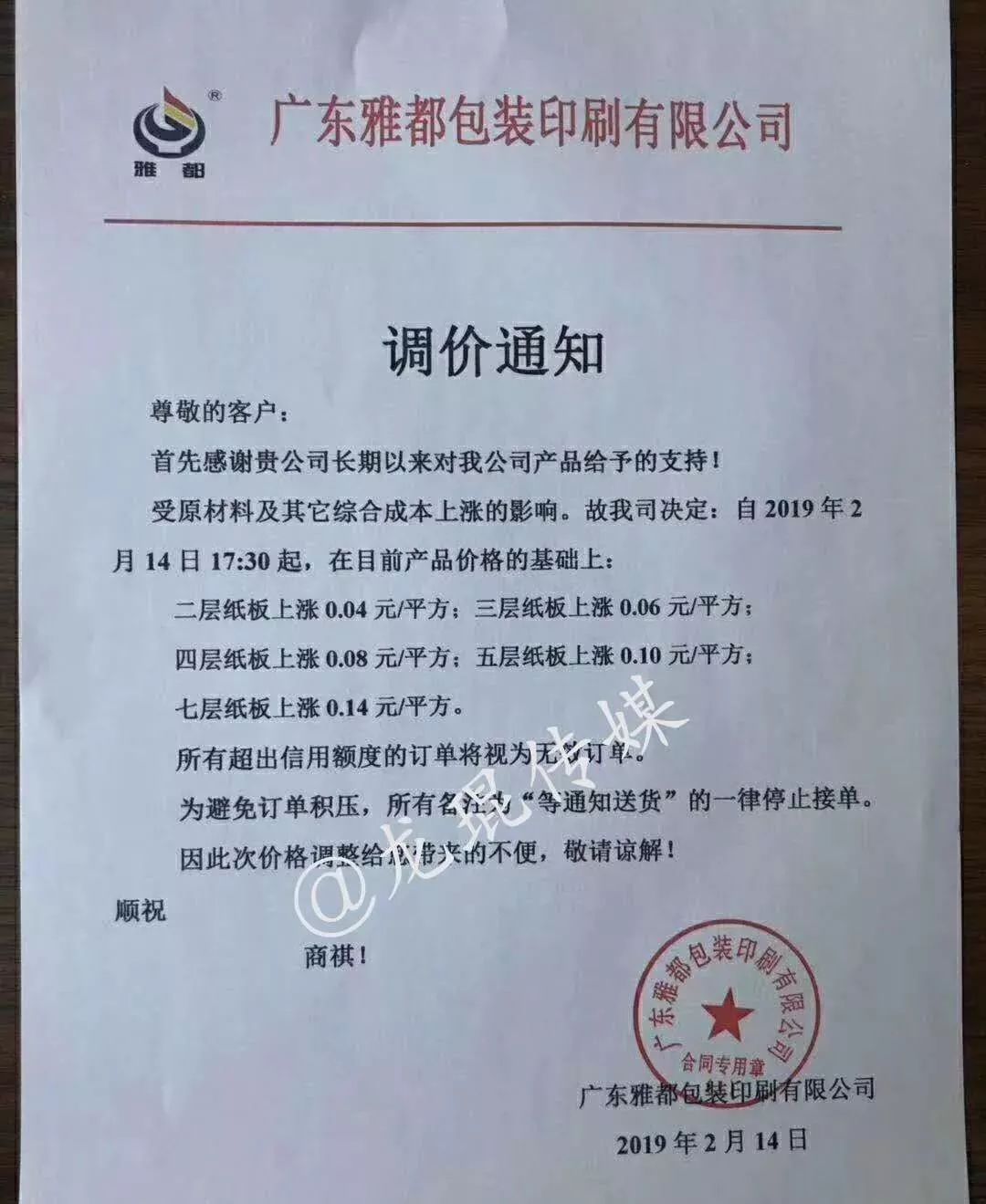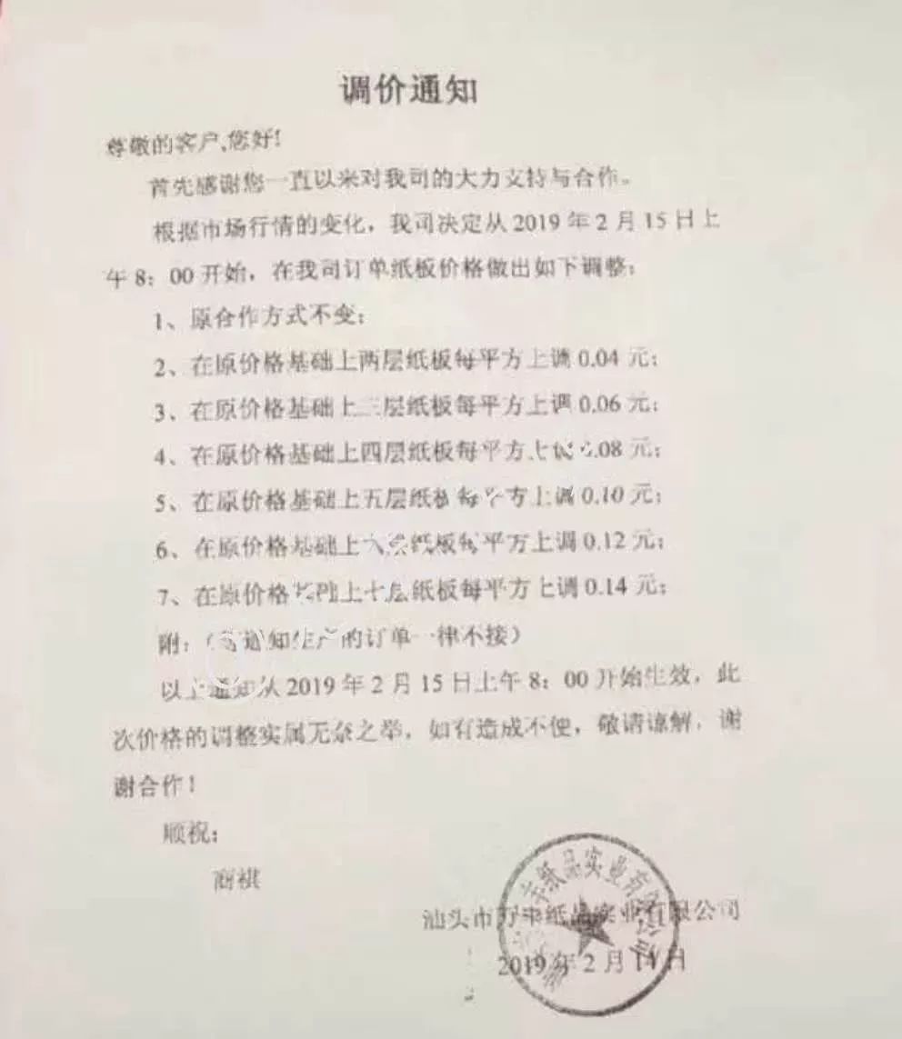自2019年2月15日上午8:00起,在原价格基础上,两层纸板每平方上调0.04元,三层纸板每平方上调0.06元,四层纸板每平方上调0.08元,五层纸板每平方上调0.10元,六层纸板每平方上调0.12元,七层纸板每平方上调0.14元。