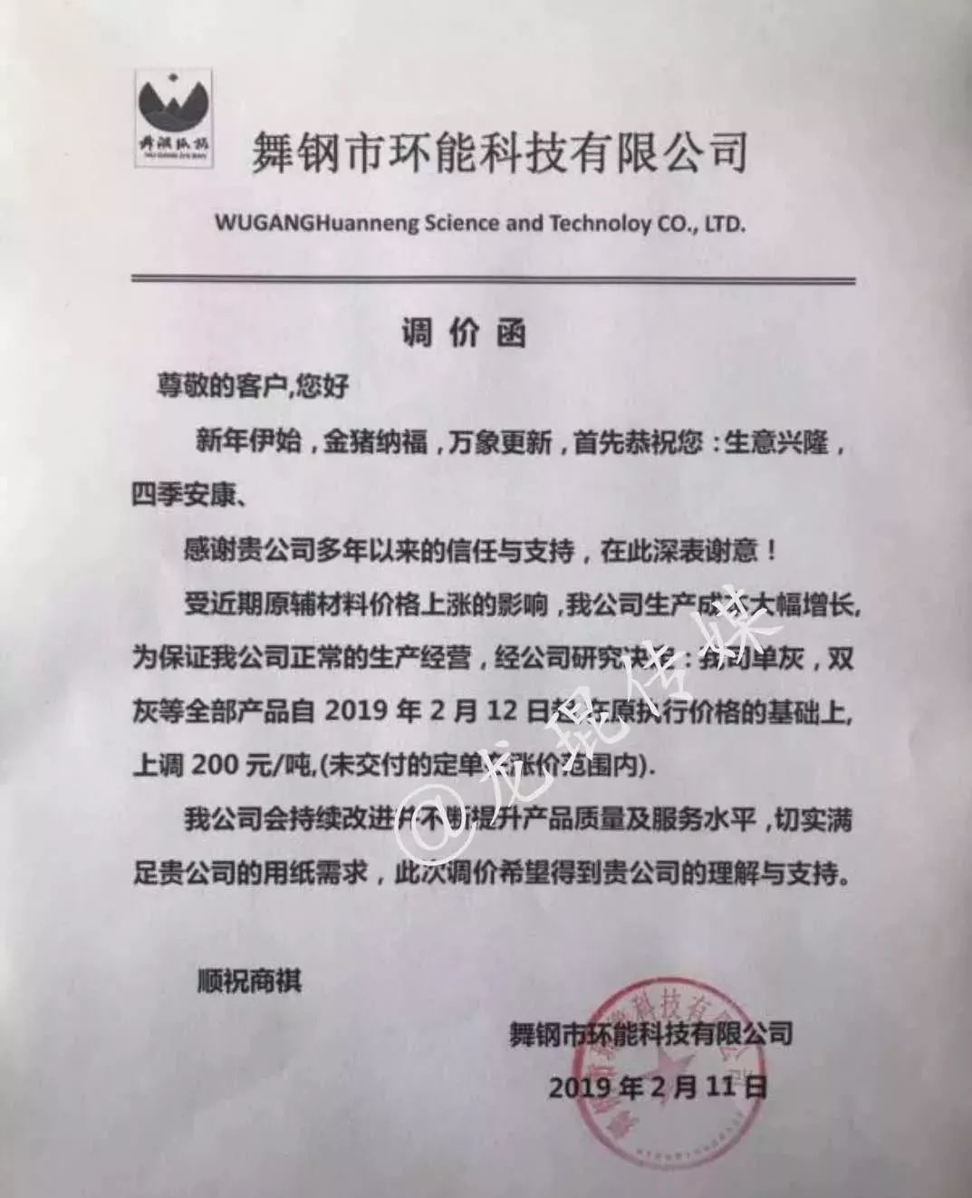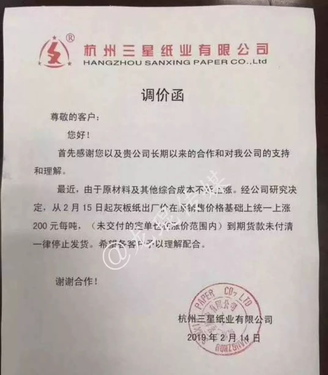 自2019年2月15日起,灰板纸出厂价在原价格基础上统一上涨200元/吨,未交付的订单在涨价范围内。