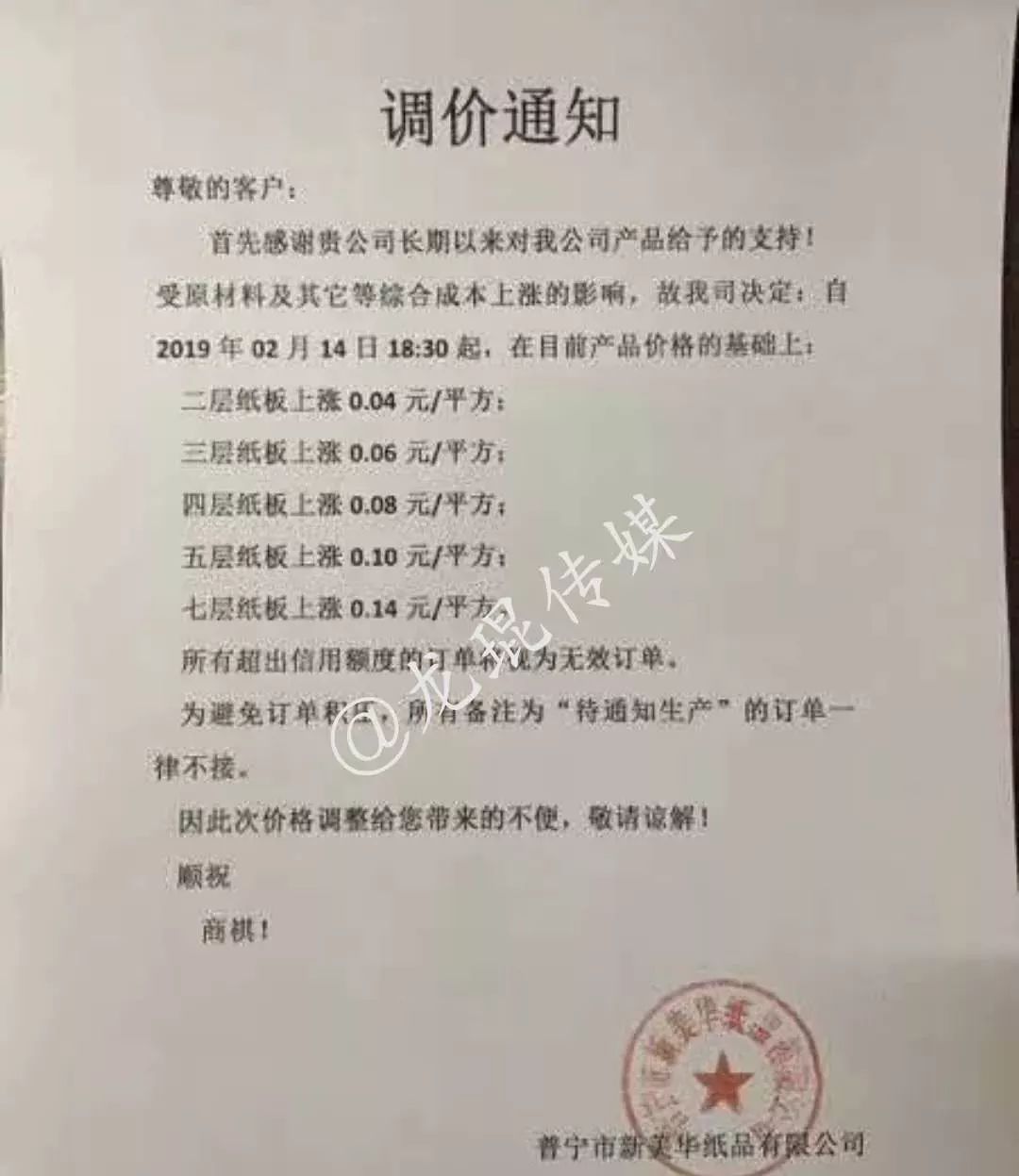 自2019年2月14日下午17:30起,三层纸板上涨0.06元/平方,四层纸板上涨0.08元/平方,五层纸板上涨0.10元/平方,六层纸板上涨0.12元/平方,七层纸板上涨0.14元/平方,待通知生产的订单一律不接。