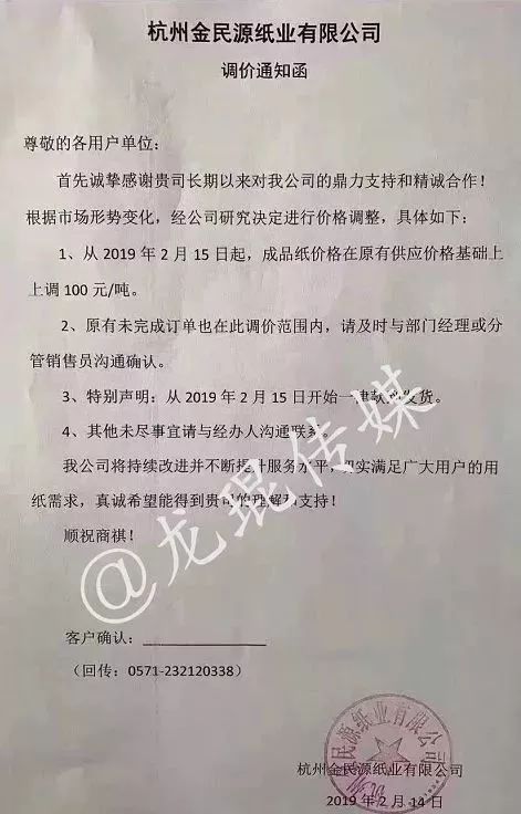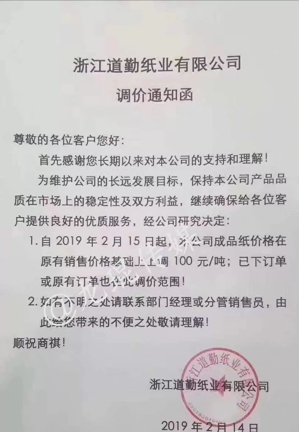 自2019年2月15日起,成品纸价格在原有销售基础上上调100元/吨,已下订单或原有订单也在此调价范围内。