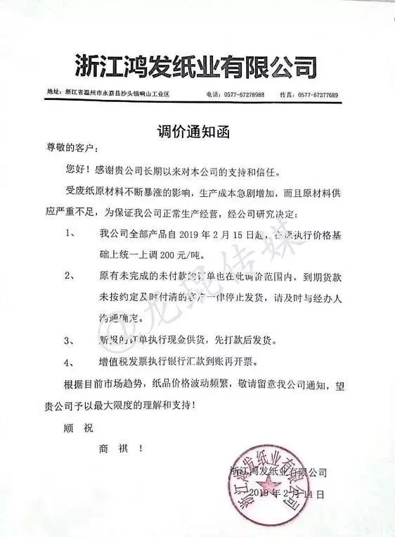 自2019年2月15日起,成品纸价格在原供应价格基础上上调200元/吨,原有订单也在此调价范围内。新报的订单执行现金供货,先打款后发货。