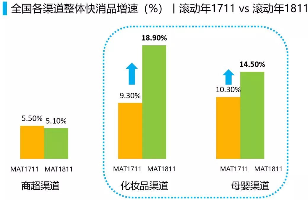 母婴渠道双位数增长,母婴市场增速明显。根据尼尔森研究,对比2017与2018年,在传统的商超渠道增长较为乏力的情况下,化妆品专营店和母婴渠道仍然维持着双位数增长,这是推动快消品线上线下全渠道增长比较重要的原因。