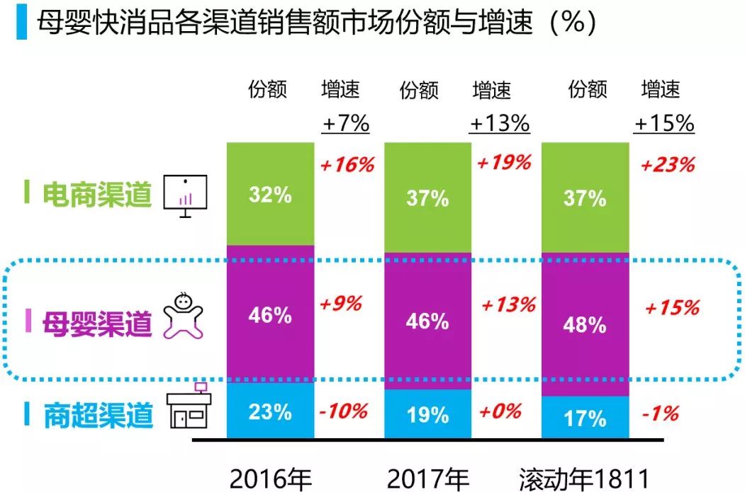 线下母婴渠道仍是主战场,份额占比持续扩大。线下母婴渠道仍是整体母婴快消品品类销售中的重要战场,占据了近50%的份额,并且销售额增速为15%。同时,线上电商继续高歌猛进,过去一年,整个母婴大品类销售额增长了23%。这两大渠道基本推动了整体母婴快消品零售市场的增长。尽管双十一等电商节对线下母婴渠道、商超渠道造成了一定的挤压,但线下的母婴渠道仍然是销售主力。