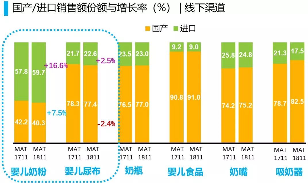 奶粉和尿布是母婴快消品中最重要的权重品类。就婴儿尿布而言,进口品牌的销售额和增长率都有上升,国产品牌稍有下降。