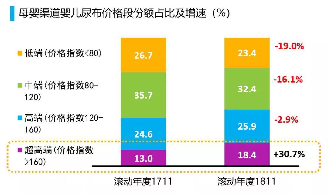 尼尔森研究显示,尿布品类中,价格在160元以上,即高于市场价格1.6倍的高端婴儿尿布增速度达到30%。