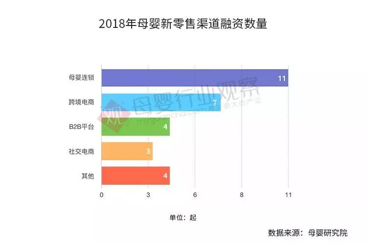 据母婴行业观察统计,2018年母婴新零售渠道投融资事件共计29起,达30.22亿元。其中,母婴连锁渠道有11起融资,跨境电商7起,B2B平台和母婴新渠道各4起,社交电商融资事件共3起。