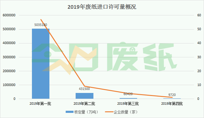 外废审批额度大幅缩减 截至目前为止,2019年度外废进口审批总额为553.68万吨。第四批审批额度仅有江苏富星纸业有限公司1家废纸企业获批进口废纸,获批量为9720吨,仅占了总额的0.002%。外废进口审批额度大幅缩减。