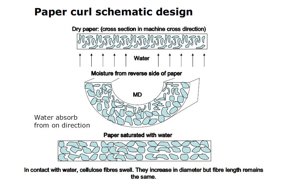 当环境中的湿度高于背纸中水分含量时,纸纤维会吸收水分膨胀,从而导致材料“翘曲”,影响材料加工性能;