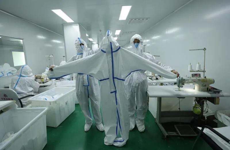 医用防护服的生产主要是利用平缝机、包缝机与压胶机等设备,对符合要求的无纺布进行裁剪,拼接,紧固,粘合压胶条等工艺处理,并经“三拒一抗”(拒水、拒血液、拒酒精,抗静电)功能性整理后,制成含有连帽上衣和裤子的医用防护服。