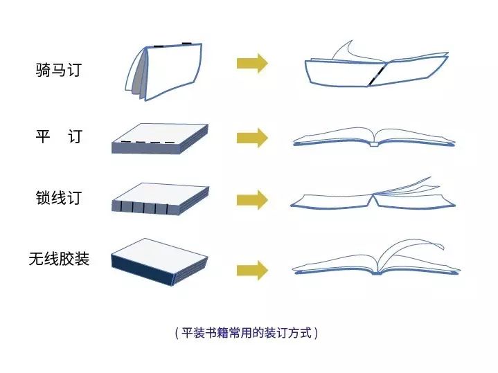 在现代平装装订方式中,包含了骑马订、平订、锁线订、无线胶装等装订形式: