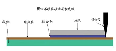 不干胶材料的模切不同于卡纸吊牌的材料,如纸张模切,那是将材料整体切穿;而不干胶材料的模切仅仅是将面材和黏合剂层切穿,即切半穿,要保留底纸和其表面的硅油涂层,最终使模切成型的标签保留在底纸上。
